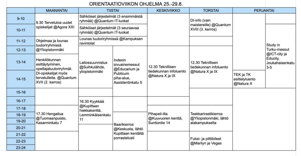 Täältä näet orientaatio viikon ohjelman, josta löydät sekä tiedekunnan virallisen ohjelman sekä Adamaksen järjestämän iltaohjelman aikataulun.